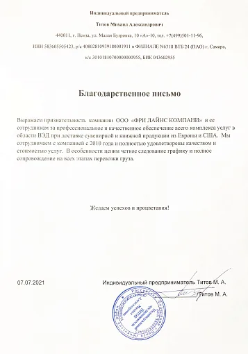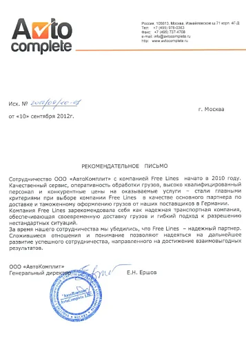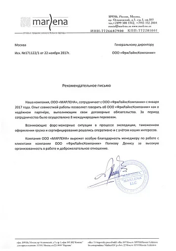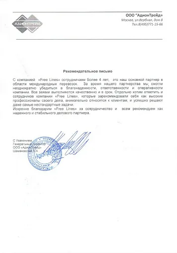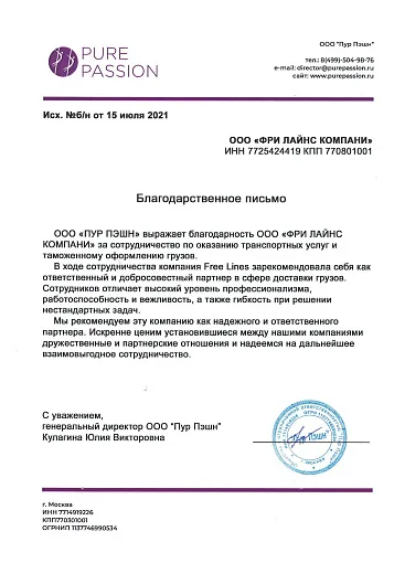 Мы также являемся аккредитованным таможенным представителем (регистрационный номер в реестре 0998 от 13.02.2019), занимаемся таможенным оформлением и оказанием услуги аутсорсинга ВЭД. Сотрудничая с нами, Вы можете быть уверены, что получаете лучшие услуги отрасли и наиболее конкурентоспособные цены. Free Lines заботится о клиентах.